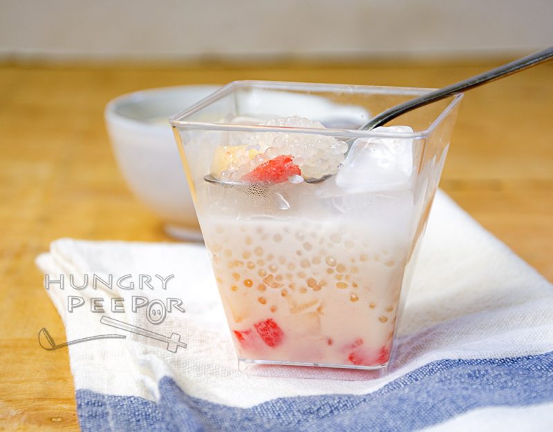 This recipe of chilled sago coconut milk is a combination of two recipes from my blog, ‘Mango Sago & Pomelo Dessert‘ and ‘Pearl Sago Pudding Is My Yummy Virgin Dessert‘. The dessert is actually not too sweet, so very nice to munch into with its chewy texture and chilled temperature – makes for a really good dessert to have on a hot sunny day too!