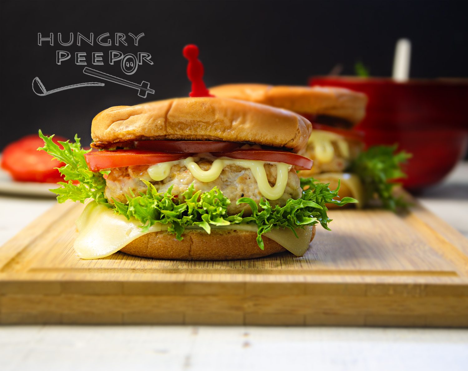- To assemble, place one slice of Gouda cheese on top of warm base bun, followed by lettuce, chicken patty, tomato slices and the top bun. Squeeze some mayonnaise onto the patty.