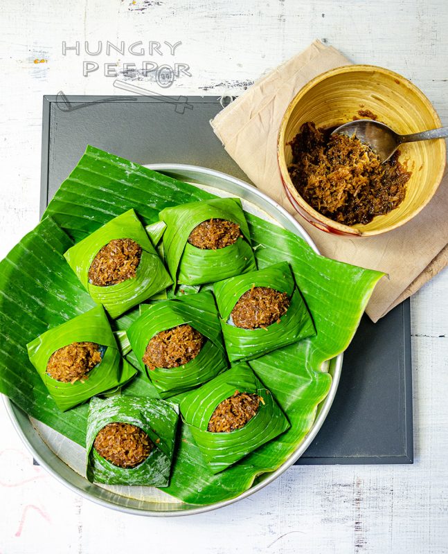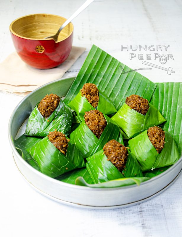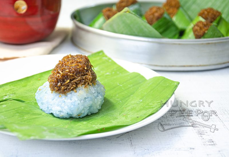 Pulut inti is a sticky glutinous rice kueh topped with sweet coconut filling and wrapped together in banana leaves. The glutinous rice, steamed together with coconut milk, combined with the grated coconut, cooked in gula melaka syrup, makes for a perfect punch. I also used some of my dried blue pea flowers to give the rice some natural blue colour (still not as blue as I want it to be though). The kueh is filling, sweet and yummy, one’s enough to fill up my tummy!