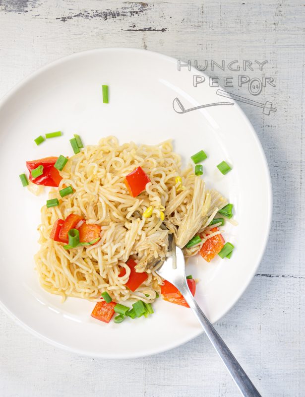 There can be ways to cook instant noodles by making it slightly healthier though. Don’t add the MSG, cook it and remove the stock so that you remove the oil from the noodles, and add vegetables. That’s what I did here, following a very old recipe of instant noodles that I keep at home like a treasure. It’s simple, delicious, and it has some nice crunch to it from the capsicums. You can use a red and green capsicum together to make the dish look even more palatable.