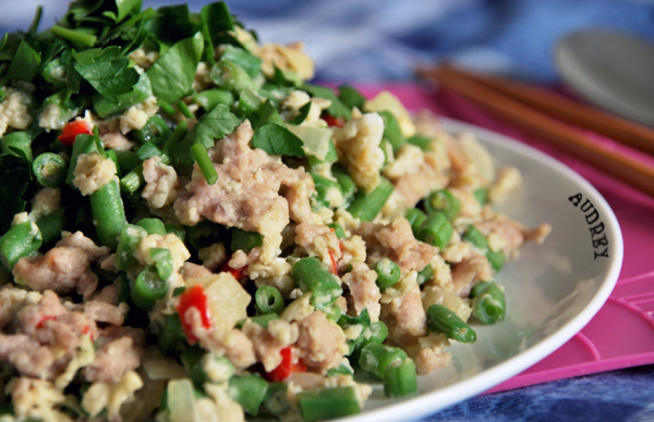 - Add chilli, long beans and salt. Stir-fry 1min.